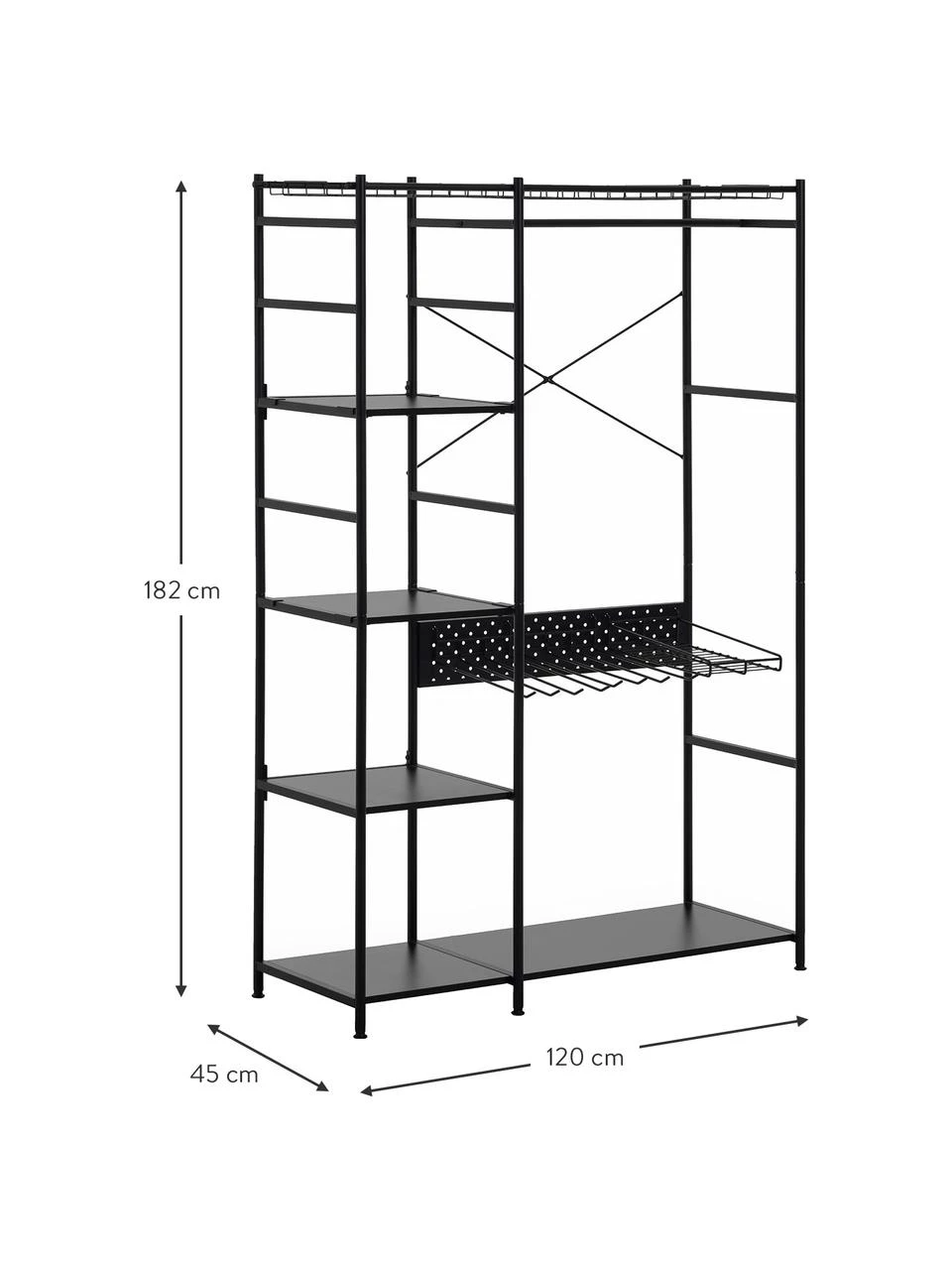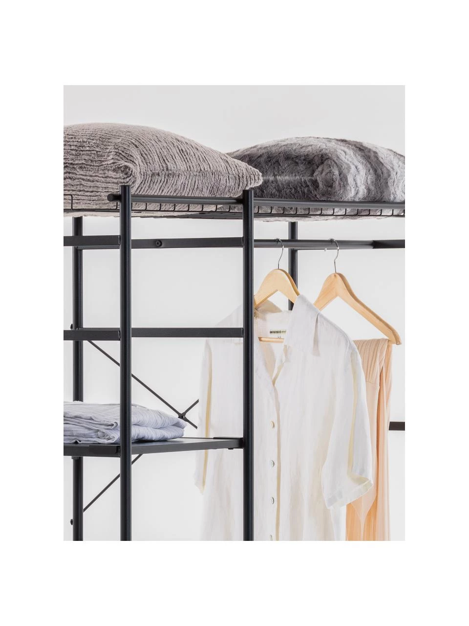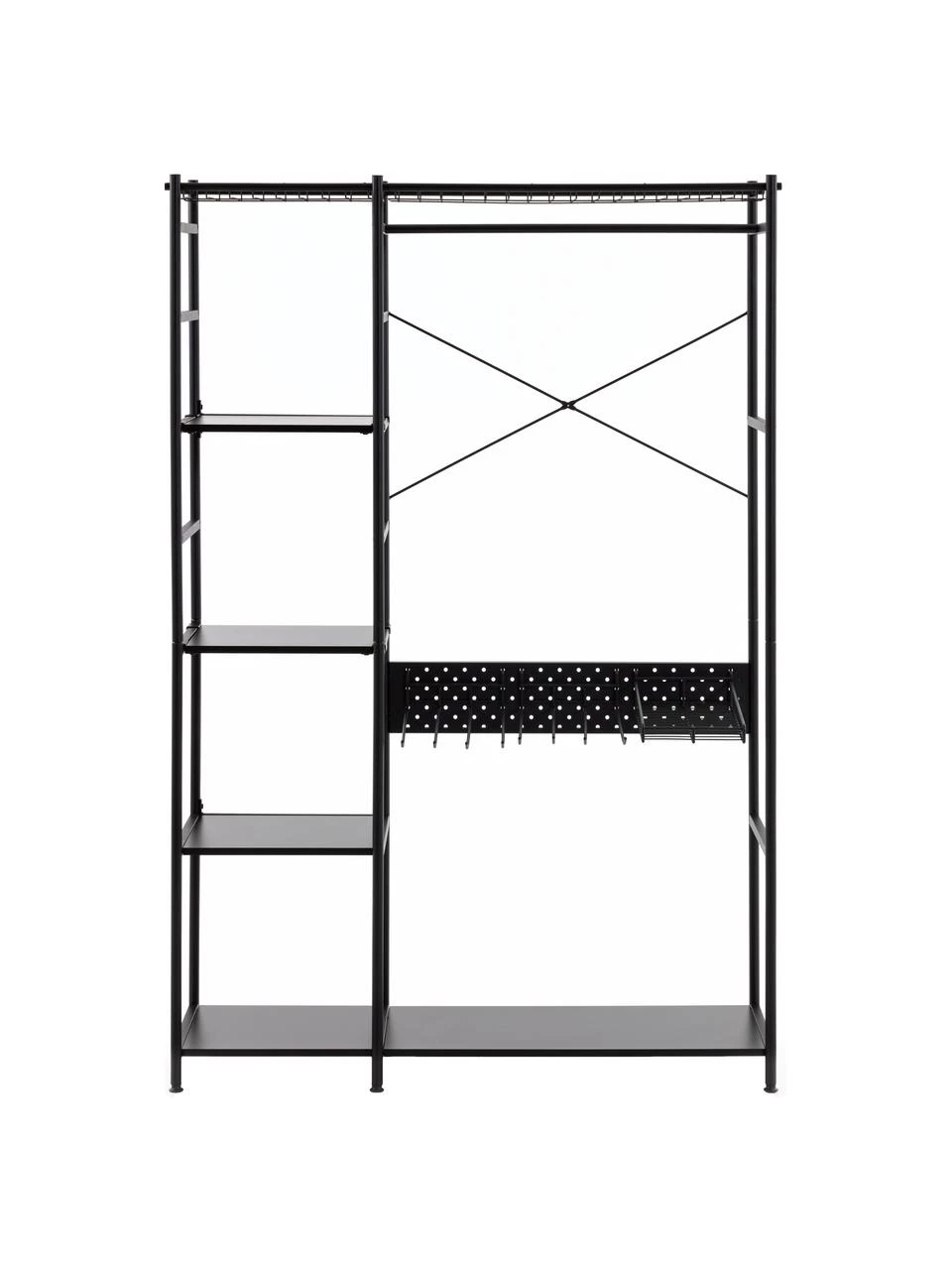 Offener Kleiderschrank mit 4 unterschiedlich großen Regalböden, einer Kleiderstange, 8 Haken und einer kleinen Ablagefläche